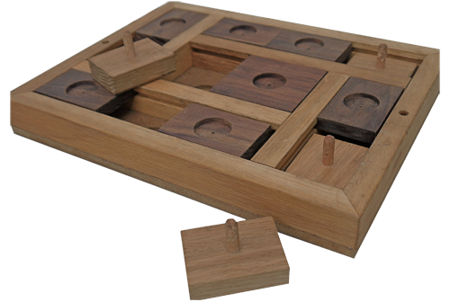 The dog has to learn how to move the slidable blocks in different directions in order to get the treats underneath as a reward. When the dog is used to this basic idea, solid blocks can be gradually introduced to make it harder. These solid blocks have to be removed before the slidable blocks can be moved out of the way to access the treats.